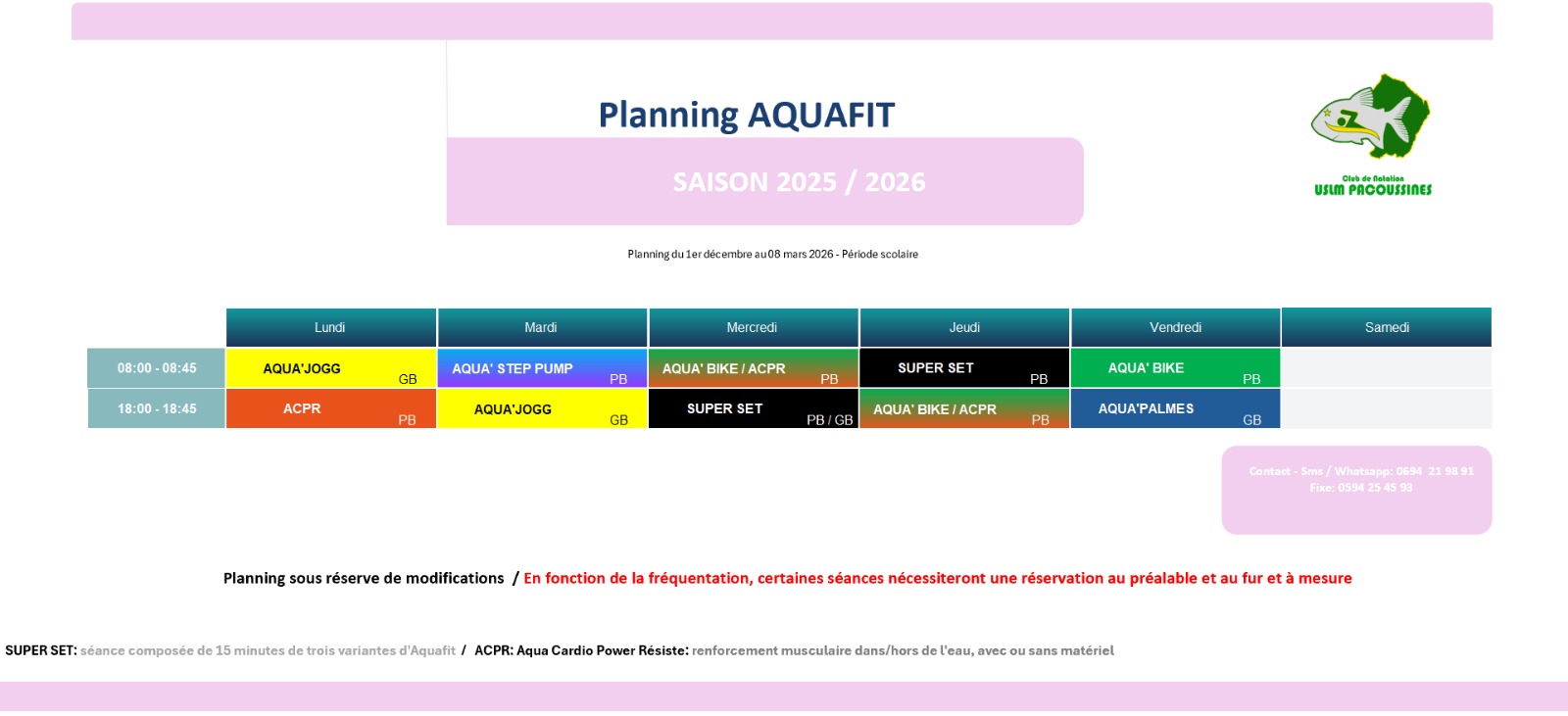 Nous proposons plusieurs variantes de l’aquafitness pour répondre à tous les profils et objectifs : Aqua’jogg, Palmes Fit, Aqua’Pump, Aqua’Step, Aqua’Bike, entre autres.